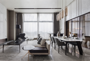 云絲細(xì)膩、調(diào)性親和的寶格麗棕大理石地面從玄關(guān)延伸至客廳和過(guò)道,穩(wěn)重內(nèi)斂,柔潤(rùn)的光澤使區(qū)域更為通透明亮??蛷d與餐廳融為一體,增強(qiáng)了家庭成員的互動(dòng),動(dòng)線趨于多元。