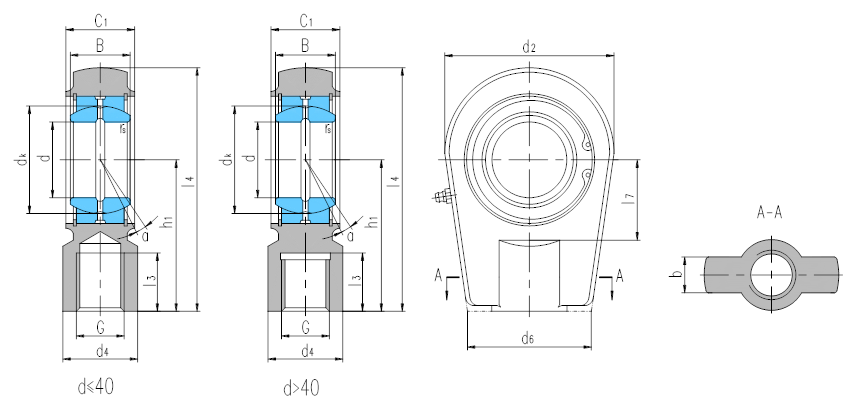 產(chǎn)品特點(diǎn):帶鎖口桿端關(guān)節(jié)軸承由桿端體和向心關(guān)節(jié)軸承GE…ES組裝而成,用擋圈固定,d<60,桿端體材料是碳鋼,60≤d≤90,桿端體材料是碳鋼或球墨鑄鐵,d>90,桿端體材料是球墨鑄鐵,SIR…ES桿端體的內(nèi)螺紋帶有鎖口,配有螺釘緊固;SIRN…ES桿端體無(wú)鎖緊螺釘,均可通過(guò)油杯潤(rùn)滑。