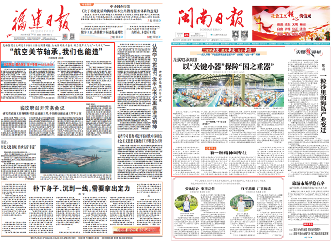 公司以國家安全為己任,自主研發(fā)全球領(lǐng)先的“三大核心技術(shù)”,突破國外技術(shù)和產(chǎn)品封鎖,助力實(shí)現(xiàn)我國“大飛機(jī)夢”。2023年6月14日《龍軸集團(tuán)自主研發(fā)出PTFE織物自潤滑襯墊,打破國外技術(shù)壟斷,助力國產(chǎn)大飛機(jī)“一飛沖天”——“航空關(guān)節(jié)軸承,我們也能造”》榮登《福建日報(bào)》頭版頭條,并獲新華網(wǎng)推介;6月25日《閩南日報(bào)》頭版頭條專題報(bào)道《龍溪軸承集團(tuán):以“關(guān)鍵小器”保障“國之重器”》;獲評漳州市“突出工業(yè)、突破工業(yè)”十件大事。