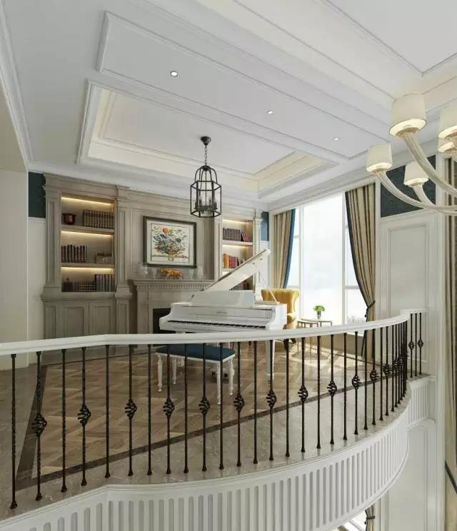 多功能間既是書房也是琴房,不大的空間講述著一段寂靜而美麗的故事。復(fù)古感的元素、花紋與線條融入設(shè)計(jì),每一處細(xì)節(jié)都是精美的藝術(shù)片。湖藍(lán)色的坐墊與純白的鋼琴搭配,隨時(shí)迸發(fā)出藝術(shù)的靈感。