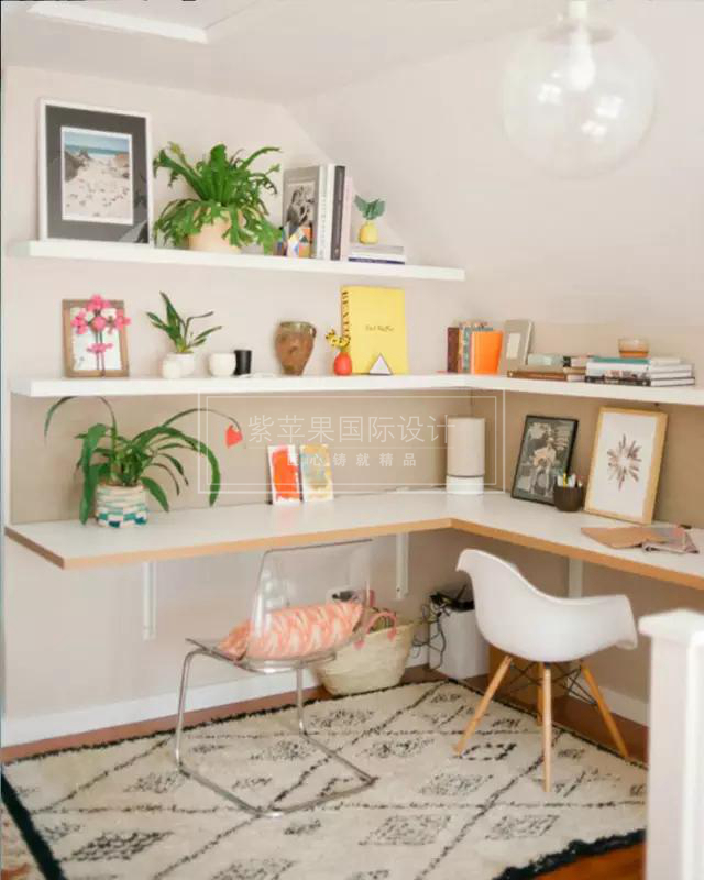 建造這樣的工作區(qū)會(huì)需要大一點(diǎn)的空間,但對(duì)比起專門的書房來說,整個(gè)成本真的會(huì)低很多,而且整齊利落,即是靈感當(dāng)中提到的置物展示空間,又可以玩電腦、做功課和工作,掛墻式的桌面和擱板置物架簡(jiǎn)潔而且價(jià)格親民,再配張地毯,整個(gè)位置立刻就亮眼了起來。
