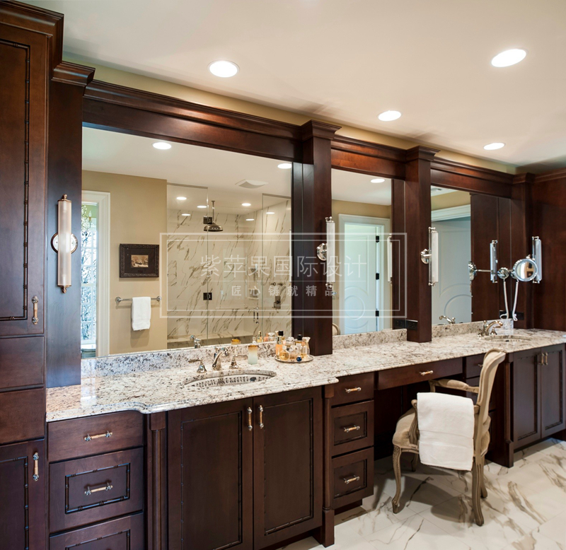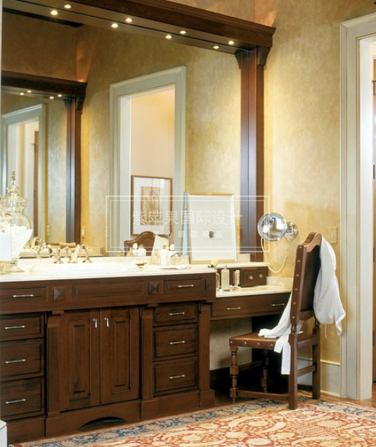 在衛(wèi)生間設(shè)計個化妝臺、防潮的小化妝品柜和一張凳子,在衛(wèi)生間就可以很方便的完成化妝、卸妝。