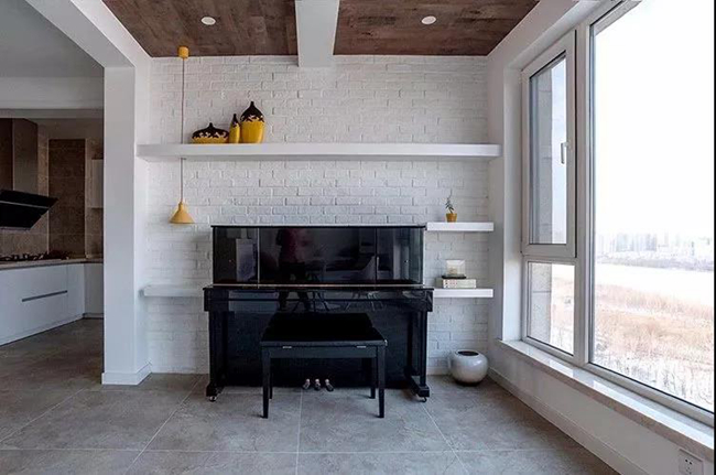 在安靜之余,休閑區(qū)的另一端以白色文化磚+擱板為基礎(chǔ),擺上一張黑色的鋼琴,靜中有聲,宛如坐在柳湖旁的一位優(yōu)雅女子,儒雅高尚。