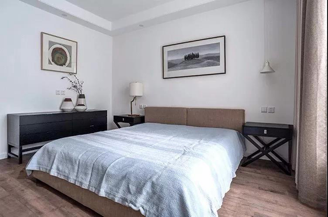 臥室空間同樣在簡(jiǎn)約為主,木地板+簡(jiǎn)潔的墻面,還有一張灰色的床單,搭配上黑色的床頭柜與斗柜,還有禪意極簡(jiǎn)的軟裝點(diǎn)綴,細(xì)節(jié)處散著一絲舒適愜意的氣息。