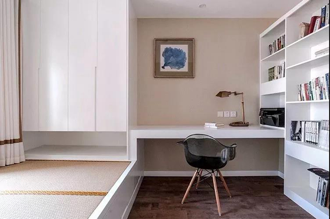 次臥以榻榻米+書(shū)桌+收納的組合設(shè)計(jì),緊湊的空間裝出實(shí)用的功能,可以作為客房也可以做書(shū)房,空間利用巧妙精致。