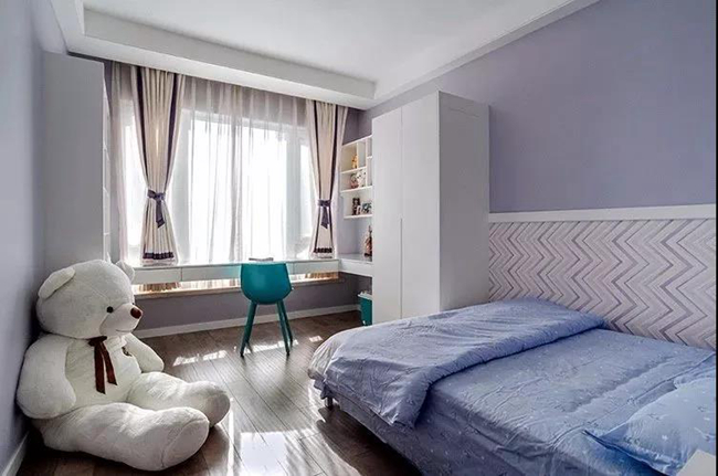 兒童房在淡淡的藍(lán)紫色為基礎(chǔ)下,墻腳部分是波浪紋的護(hù)墻板,配上一套淡藍(lán)色的床單,還有一只大公仔,充滿了輕松愜意的氣息。