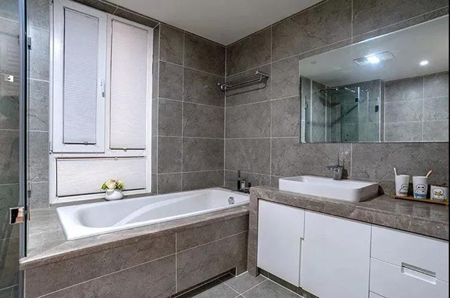 衛(wèi)生間裝了個(gè)浴缸,整體大理石與瓷磚封裝的空間,簡(jiǎn)約時(shí)尚而又實(shí)用高檔。