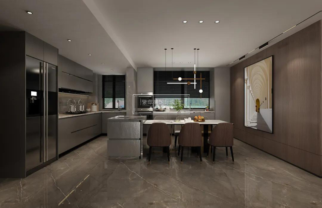 開放式餐廳讓人自在不拘束,與廚房緊鄰,可以家人間方便溝通交流,簡潔的吊燈與巨大的藝術(shù)掛畫,給深色調(diào)的空間增添活力與趣味。