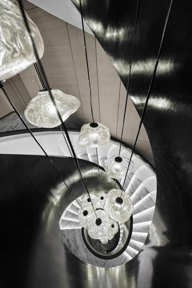 樓梯使用黑白色經(jīng)典搭配,簡(jiǎn)約沉穩(wěn),個(gè)性裝飾吊燈,仿佛一幅立體畫(huà)般,與整體融合成為立體的藝術(shù)品。