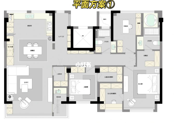 居室都在南面,一個(gè)大的套房作為主人的休息區(qū),另一個(gè)兒童房,適合小年輕居住,北面的空間主要是小書房和洗浴區(qū)域。