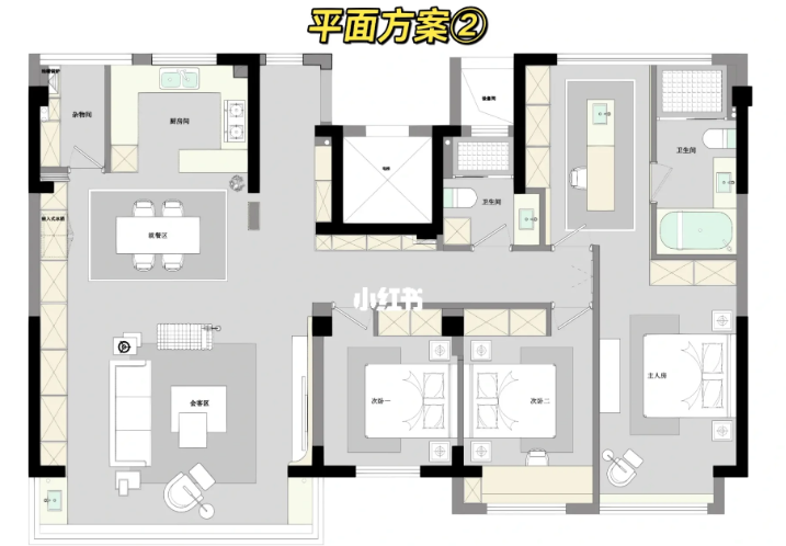 首先做了一個(gè)敞開式的大廚房,此方案兩個(gè)臥室,起