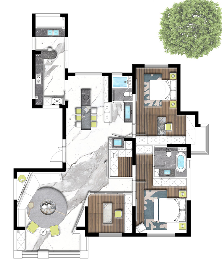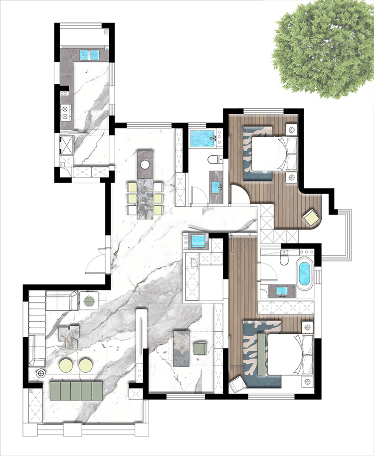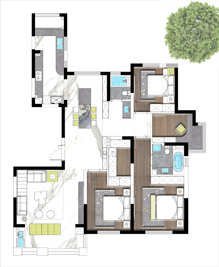 方案二也是設(shè)計師主推的一套方案,進(jìn)門一個玄關(guān),整體空間往南面移了一點,由于承重結(jié)構(gòu)進(jìn)入客廳的過道永遠(yuǎn)打不開,是大平層的空間感提現(xiàn)不出來,所以我們設(shè)計師如圖拉了一個平行的造型,追大程度打開這塊空間,然后其他兩塊區(qū)域也劃分明了,大人小孩互不干擾,書房也設(shè)置在南面,整體視野非常開闊,可以看到蠡湖風(fēng)景。客戶也很此套方案。方案三也比較常規(guī)