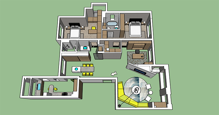 方案一比較常規(guī),進(jìn)門開放處理,做了一個玄關(guān),兩個房間朝南,餐廳旁邊做了一個玻璃移門,平時可以關(guān)起來!