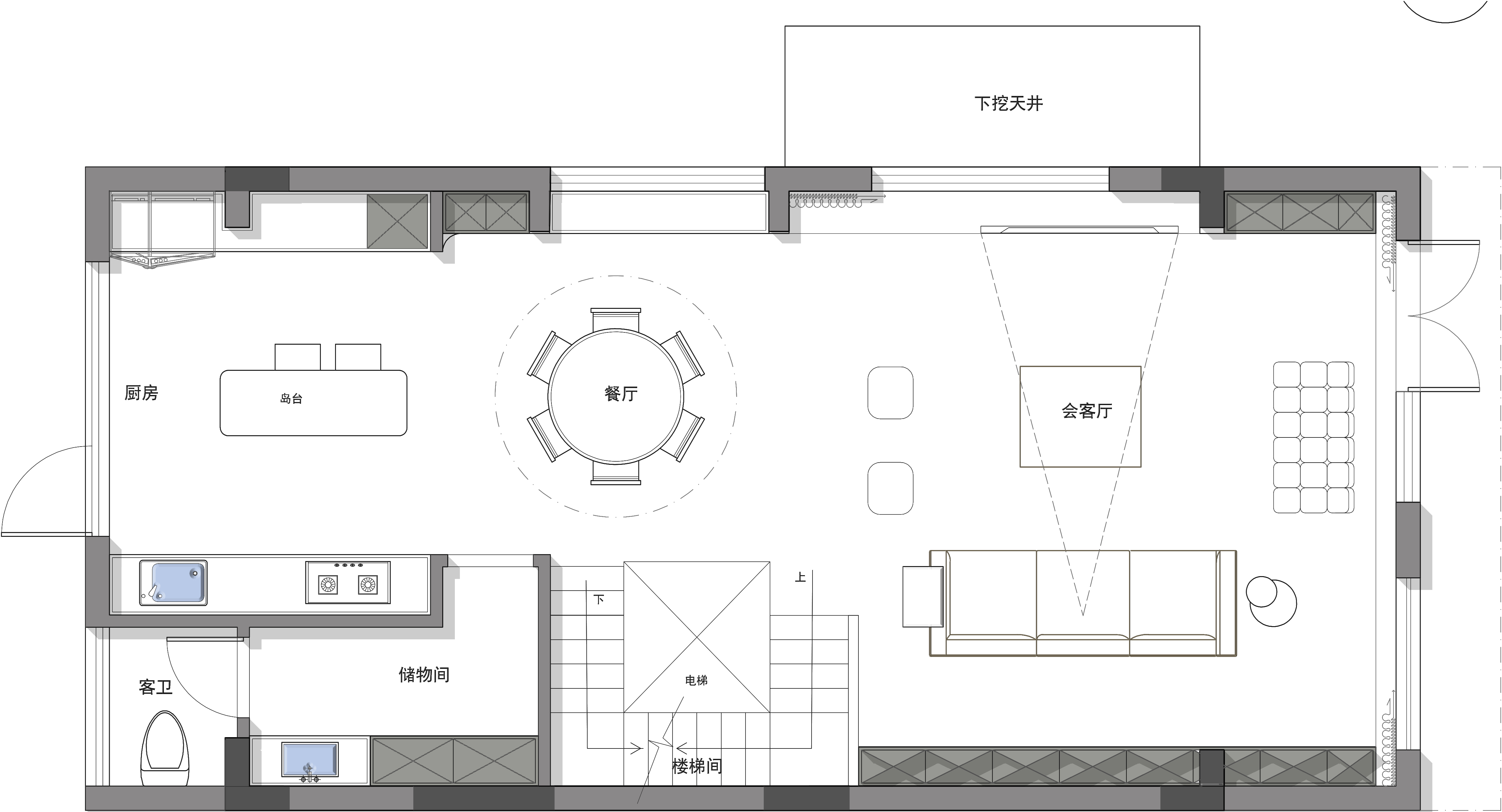 地下室也是基礎(chǔ)的休閑待客區(qū),一樓的廚房比較有特色,進門之后穿過客廳,就是開放式廚房加長有一個長島臺,客餐廳連在一起一樓很通透開闊!廚房那邊開了一個后門方便去后院!