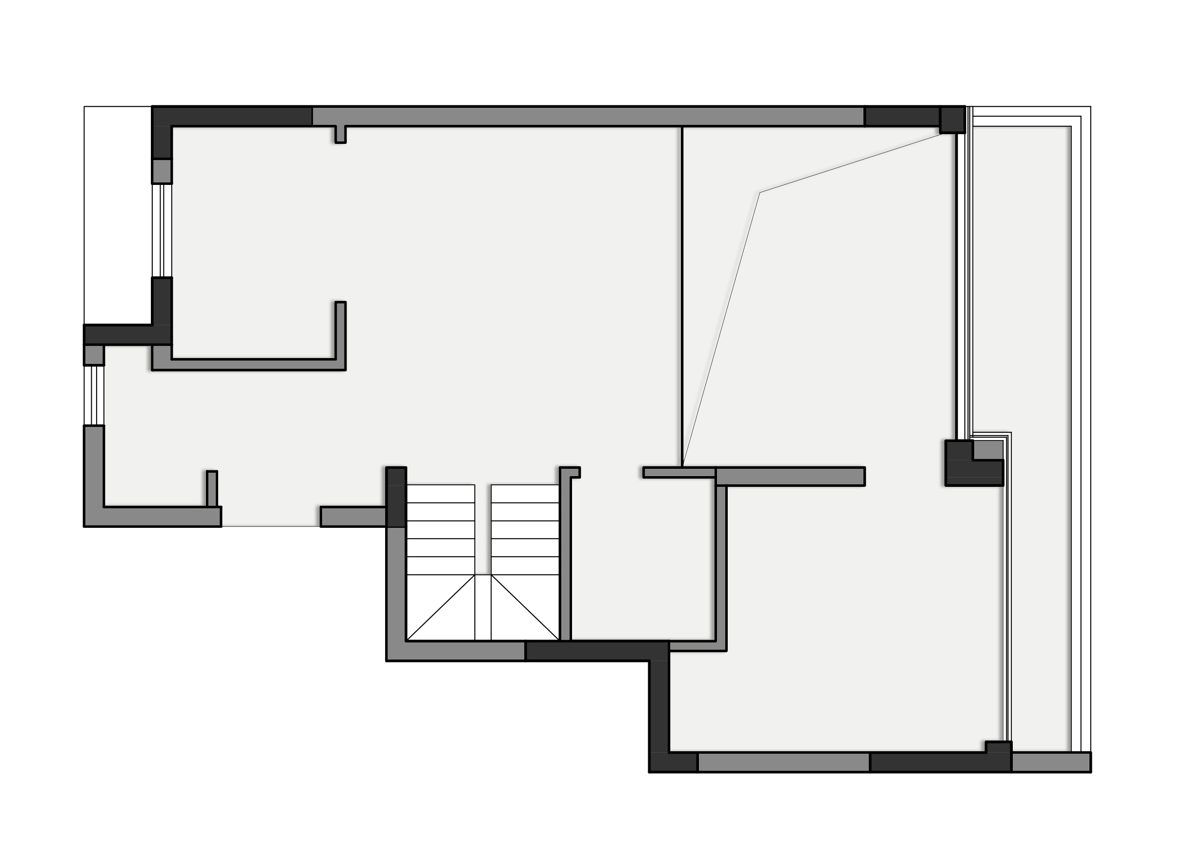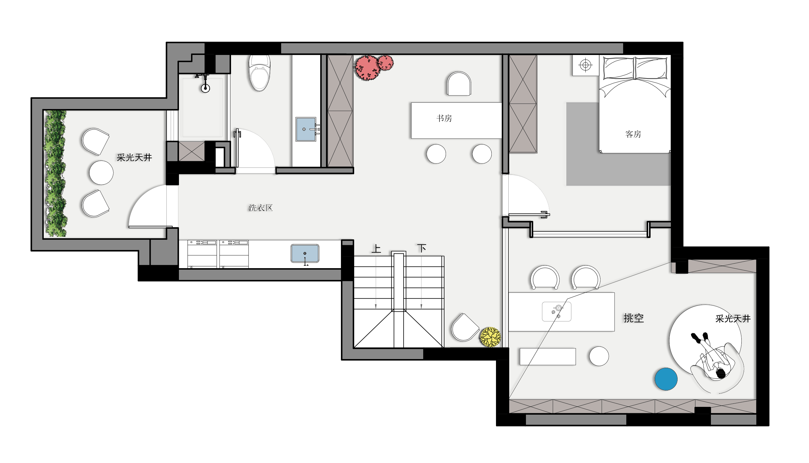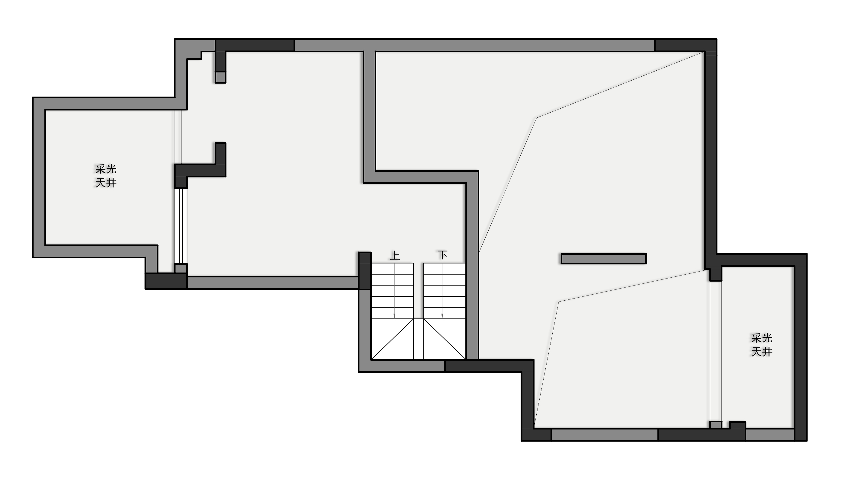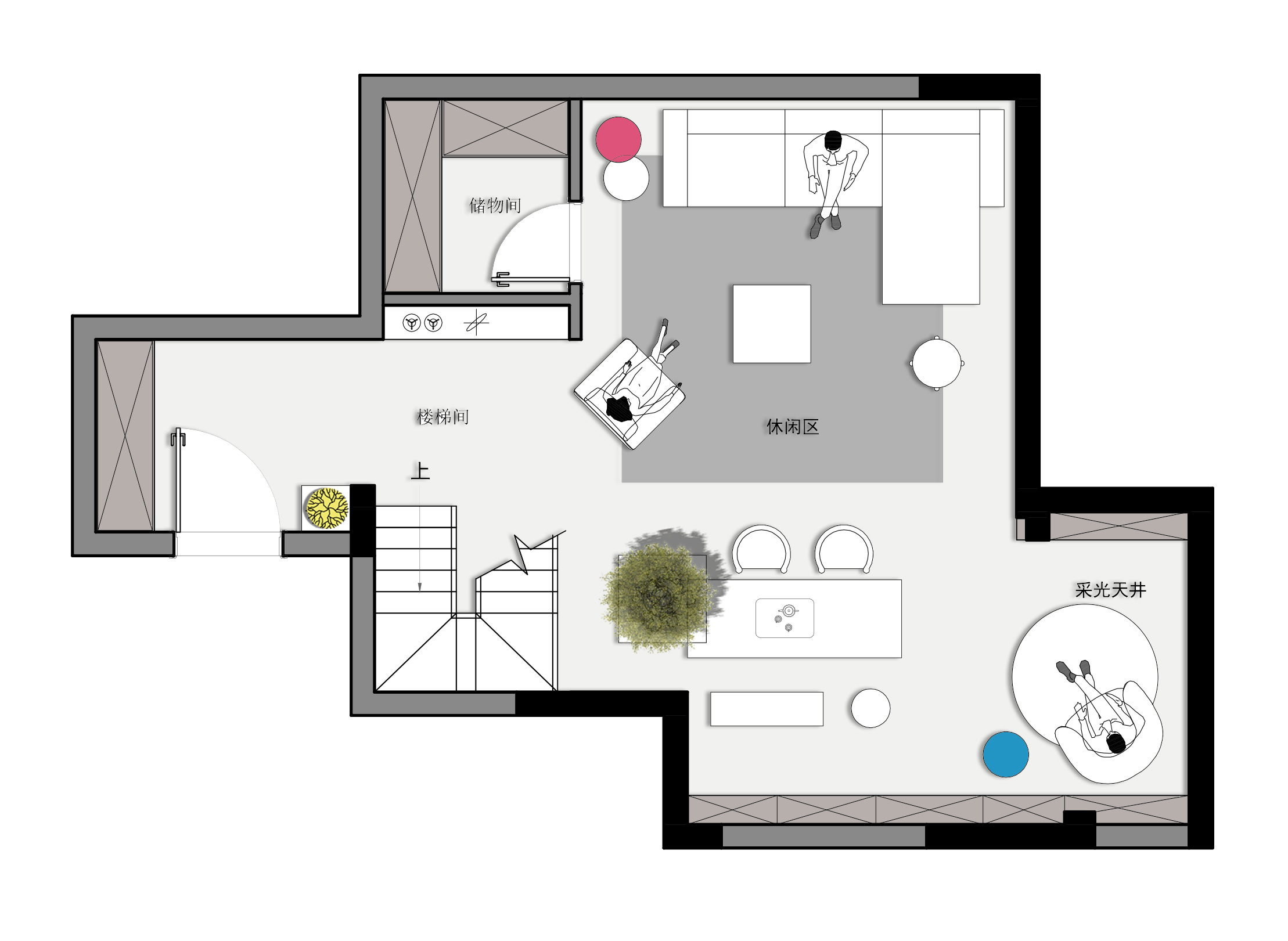 3?負(fù)一層保留了大挑空,結(jié)合少量現(xiàn)澆,把空間變得更方正,利用率更高。將北面采光井也納入室內(nèi)規(guī)劃范圍,難處理的Z字形承重柱用柜子做裝飾,滿足了儲物需求,空間也更加美觀。這個空間主要作為多功能的書房和儲物間來使用,滿足客戶工作、