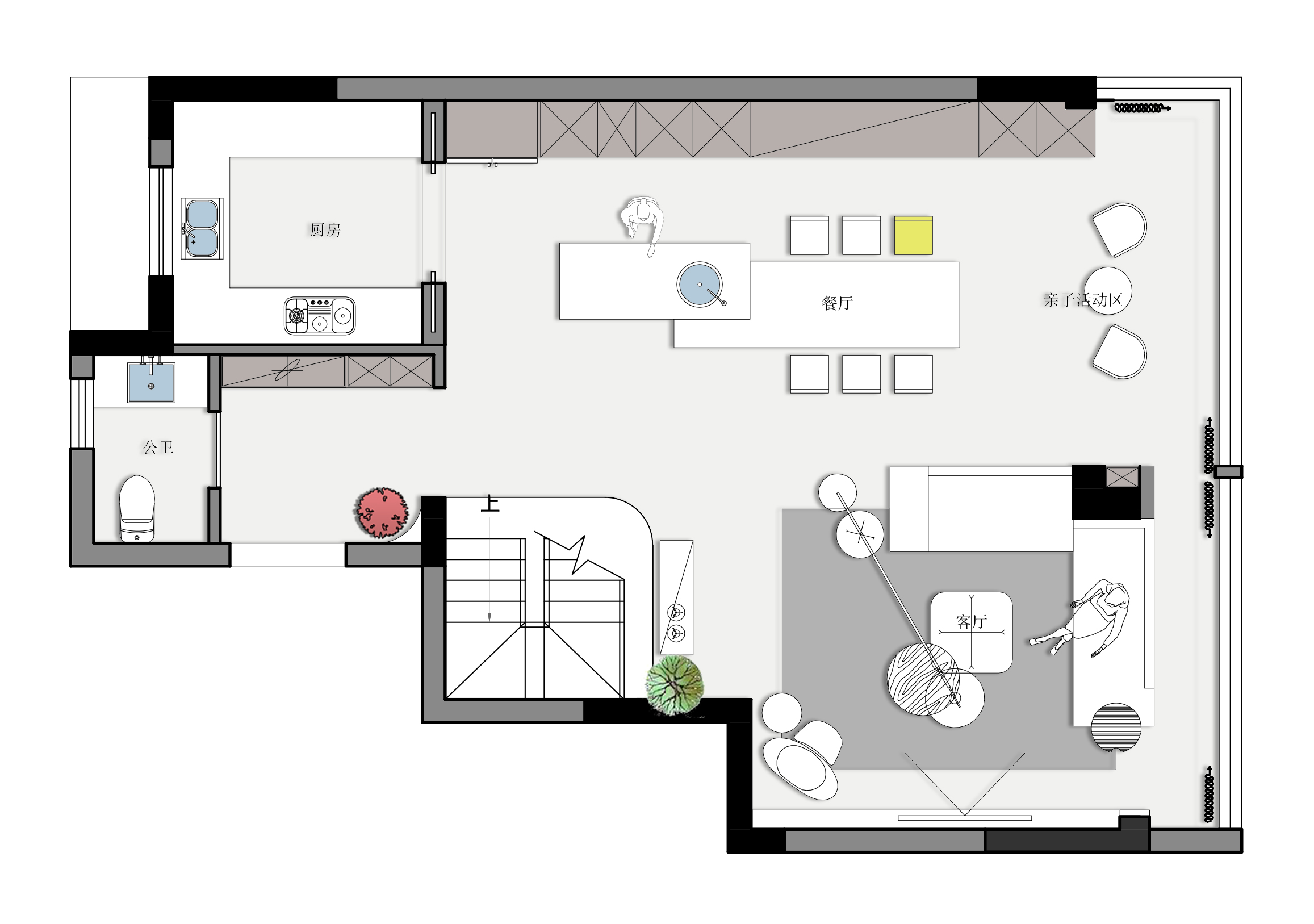 1?一層通過敲砌墻調(diào)整了空間的完整性。入戶做了