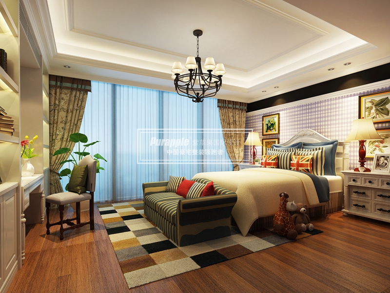 因為美式家居風格的這些元素也正好迎合了時下的文化資產(chǎn)者對生活方式的需求,所以:有文化感、有貴氣感,還不能缺乏自在感與情調(diào)感。從圖中臥室中窗簾,背景墻,沙發(fā)以及地毯又加上實木的地板總體的顏色搭配與色調(diào)全全體現(xiàn)了美式風格的一個文化與貴氣。當然再加上燈具以及一些家居的呼應,或許你已經(jīng)覺得自己置身在美國家中。