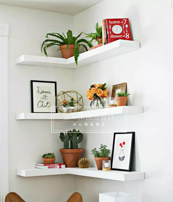 像上圖這樣安裝幾層轉(zhuǎn)交式的置物架是個不錯的主意。簡單放上鮮花綠植、畫作和小裝飾就已經(jīng)很漂亮,當然,你還可以用來放書,或者漂亮的餐具。不過在放的時候一定要考慮到置物架的承重能力,以免發(fā)生意外。