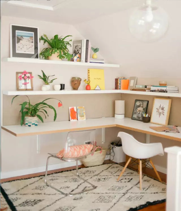 建造這樣的工作區(qū)會需要大一點的空間,但對比起專門的書房來說,整個成本真的會低很多,而且整齊利落,即是靈感當中提到的置物展示空間,又可以玩電腦、做功課和工作,掛墻式的桌面和擱板置物架簡潔而且價格親民,再配張地毯,整個位置立刻就亮眼了起來。