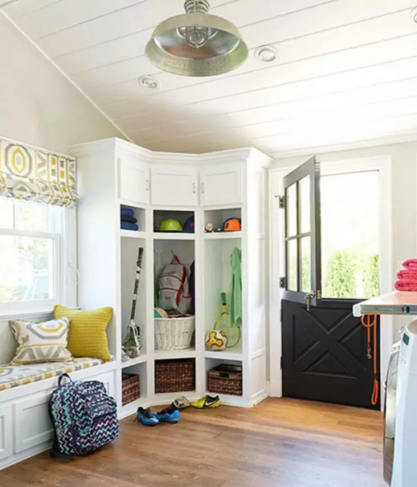 臥室或者是玄關(guān)附近位置的尷尬角落,放一個轉(zhuǎn)角式的置物柜會是個不錯的做法。安裝在入門位置的話,運動用品、健身背包、書包、遛狗繩之類的,可以全部都集中在這個位置,干凈整齊。至于臥室里,則是衣柜的延伸,但只適合家里面積比較大,看起來有點空蕩蕩的家庭。