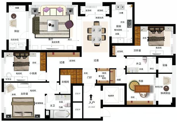 業(yè)主的需求:對(duì)功能要求比較全(獨(dú)立書房、衣帽間,儲(chǔ)藏室等),且在滿足功能的前提下,首先通過對(duì)整體空間的局部改造,是整體布局更趨合理化;淺色調(diào)為主,富有家的溫馨。