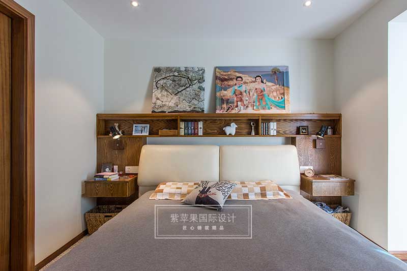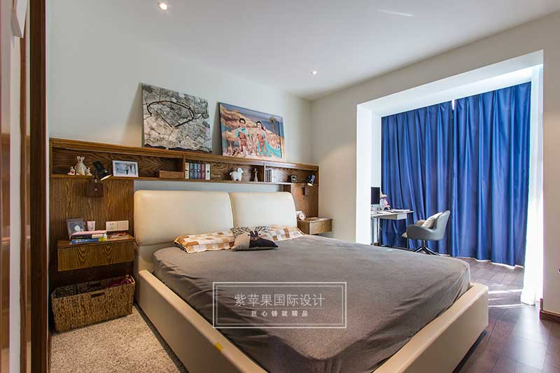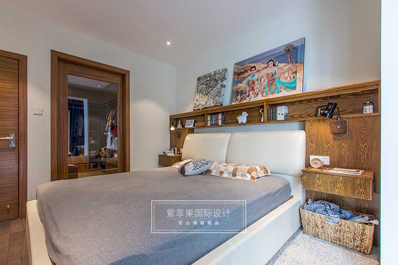 主臥的整體設(shè)計(jì)充滿藝術(shù)氣息與時(shí)尚情調(diào)。深木色的床頭柜給人以簡約而靜謐的感覺,灰色的床品讓空間顯得雅致而舒服。床頭柜足夠多的收納空間設(shè)計(jì),既可以起到裝點(diǎn)作用,也可以為業(yè)主生活帶來便利性。
