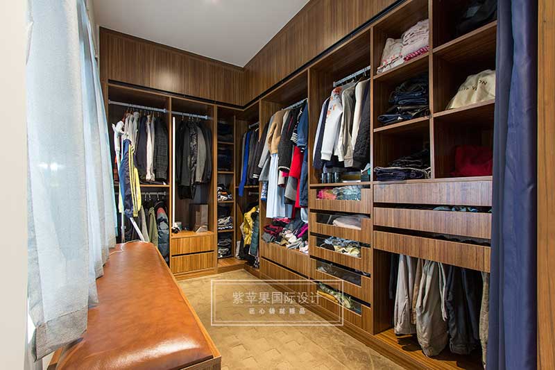 由于主臥無儲(chǔ)物空間,緊鄰臥室,設(shè)計(jì)師為業(yè)主打造一個(gè)具有足夠收納空間的獨(dú)立衣帽間。深色大面積木質(zhì)木柜,既沉穩(wěn)大氣而又充分利用空間,有著業(yè)主獨(dú)特的情調(diào),陽光照耀室內(nèi),舒心而自在。