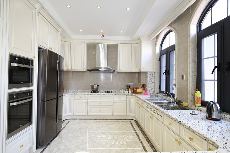 白色的櫥柜加白色的大理石地面和花式臺(tái)面,廚房給人的感覺(jué)清潔,明亮,視覺(jué)上很舒服。