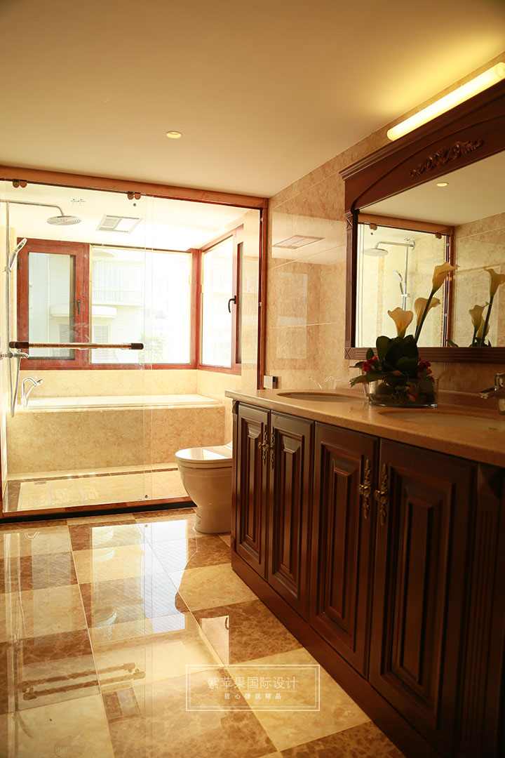 衛(wèi)浴室空間通透,采光好,造型上簡(jiǎn)約,不失精致。古典與現(xiàn)代的結(jié)合,設(shè)計(jì)師以簡(jiǎn)潔的表現(xiàn)形式來(lái)滿足人們對(duì)空間環(huán)境那種感性的、本能的和理性的需求。