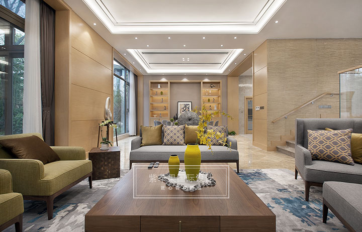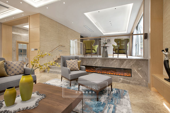 客廳設(shè)置內(nèi)嵌式電子壁爐,巧妙創(chuàng)新有樂趣;錯層處運用玻璃扶手,增強整個空間通透之感,讓視線廣闊無遮攔。電子壁爐和玻璃扶手的運用,都可以看出設(shè)計師從細節(jié)出發(fā)極力在營造一個精致、大氣、現(xiàn)代感十足的生活空間。