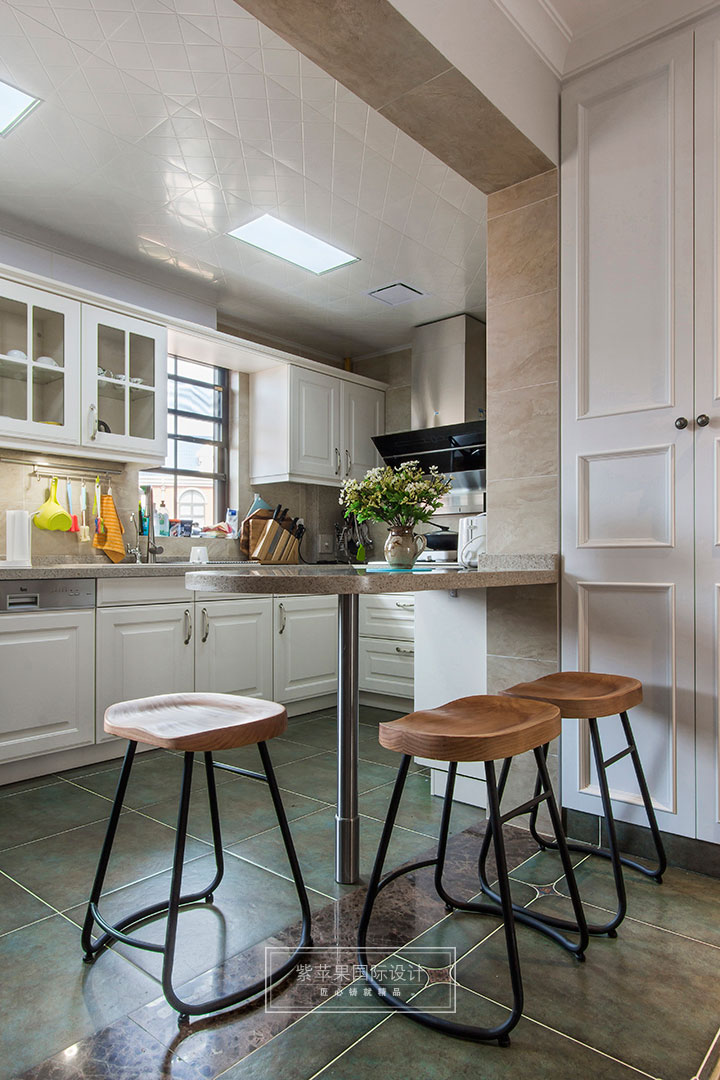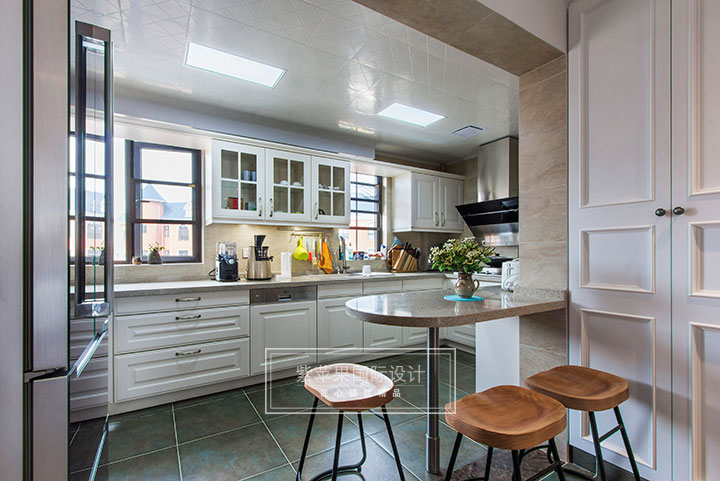 廚房是體現(xiàn)居家品質(zhì)的重要空間。在本案中,廚房本連接一個(gè)生活陽臺(tái),但是應(yīng)業(yè)主對(duì)廚房空間“寬敞”的需求,設(shè)計(jì)師將生活陽臺(tái)進(jìn)行拆除,納入廚房空間,同時(shí),設(shè)計(jì)師對(duì)廚房采用開放式廚房設(shè)計(jì),并在廚房和餐廳間做了一個(gè)小吧臺(tái)的設(shè)計(jì),讓餐廳廚房聯(lián)通,使得整體空間通透關(guān)聯(lián),讓餐廳也有自然光線注入,更顯寬敞明亮。