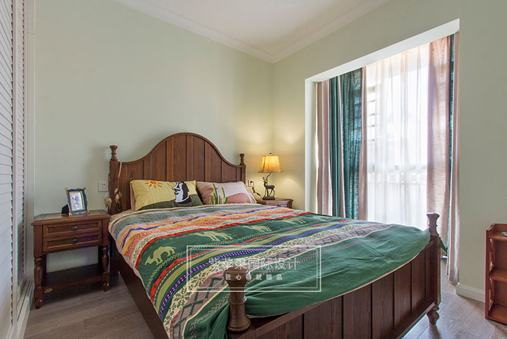 女兒房區(qū)別主人房藍(lán)色色調(diào),采用稍顯活潑的綠色,同樣也利用一面墻的空間做了衣柜,便于收納。