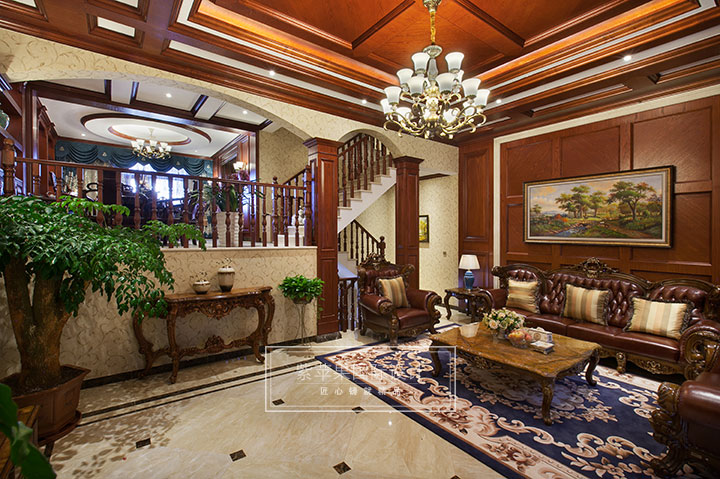 客廳采用大理石磚為主,優(yōu)雅的藍(lán)色演繹著一種高貴的寧?kù)o。白色的天花和實(shí)木的墻壁,為空間奠定了厚重的主基調(diào),而家具和飾品的色彩,精心搭配選擇之后,則流露出奢華而浪漫的古典韻味。